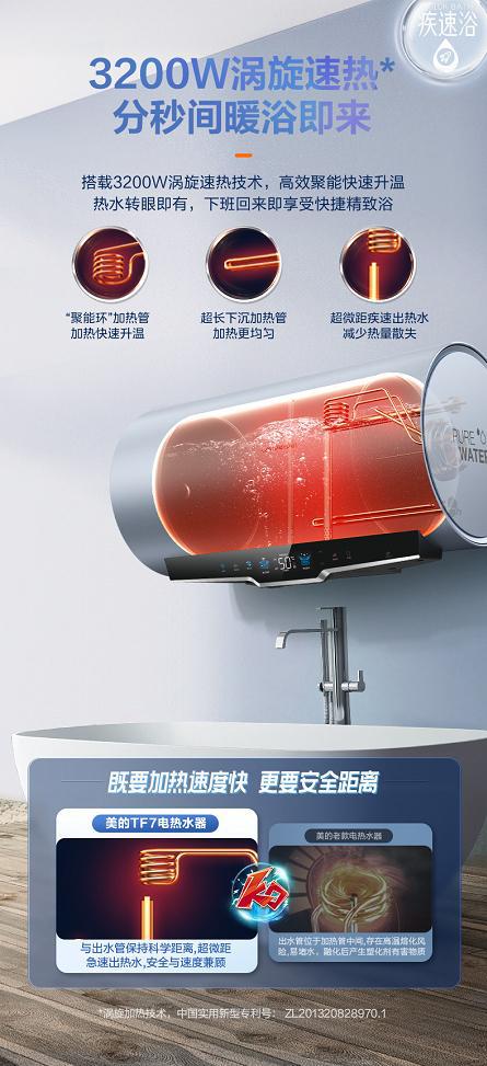 美的恒凈電熱水器TF7搭載3200W渦旋速熱技術(shù),采用“聚能環(huán)”加熱管,高效聚能快速升溫,并且超長(zhǎng)下沉加熱管,加熱更均勻,讓用戶下班回來(lái)即可快速暢享凈膚暖浴。