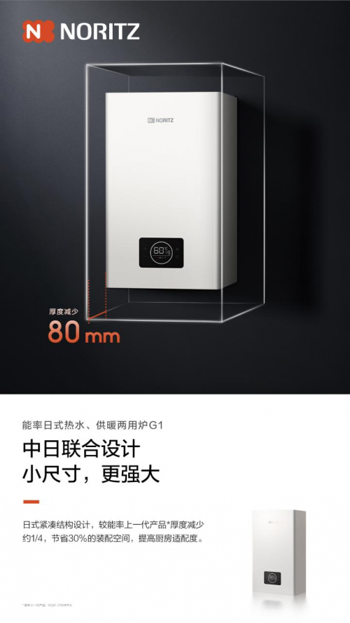 能率日式熱水、供暖兩用爐G1由中日聯(lián)合研發(fā),運(yùn)用匠心美學(xué)藝術(shù),延續(xù)了日式采暖爐簡約緊湊型結(jié)構(gòu),小尺寸專為中國式廚房而設(shè)定,有效增大空間利用率,適配各種廚房環(huán)境,節(jié)約空間,安裝便利。無論是新裝換裝,都無須煩惱裝配問題,還廚房更多“自由使用”空間。