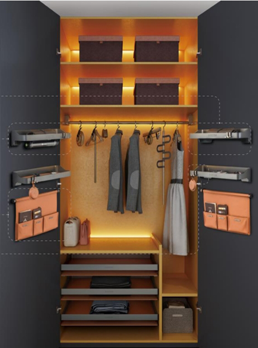 簡·愛保羅的衣柜精確把握年輕群體的消費心理,以擁有高級質感的中性灰作為主調,輔以愛馬仕橙與金屬色作搭配。在簡·愛保羅設計師的手下,安靜的中性灰遇到耀眼的愛馬仕橙,打破原本傳統(tǒng)陰郁的空間氛圍,為單調的空間注入了新鮮活力,演繹出時尚經典的別樣輕奢,最大程度地發(fā)揮衣柜的時尚魅力,給人以絢麗時尚的視覺觀感。