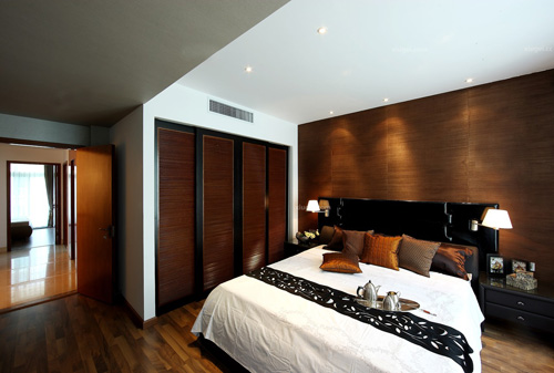 臥室的整體色調(diào)以咖啡色為主,輔以灰色和駝色為搭配,同為中性色的色彩以深淺的變化將視覺層次體現(xiàn)出來?;疑能洶尘皦哂泻芎玫母粢糇饔?,而且在色彩上映襯了咖色主題。床體的色彩為深咖啡色,顯得更加具有厚重感和穩(wěn)重感,在色彩上奠定了咖色的主調(diào)地位,軟裝布藝的選擇也極富時(shí)尚感。