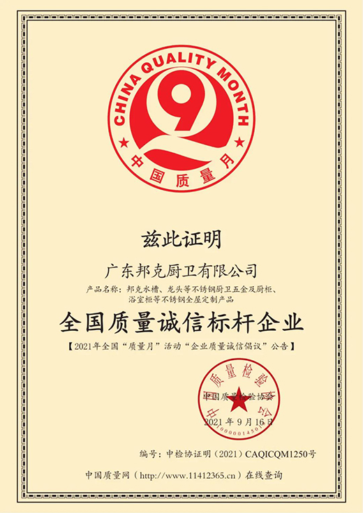 2021年9月,由國(guó)家市場(chǎng)監(jiān)督管理總局、中共中央宣傳部、國(guó)家發(fā)展和改革委員會(huì)等20個(gè)部門聯(lián)合開展以“深入實(shí)施質(zhì)量提升行動(dòng),大力推進(jìn)質(zhì)量強(qiáng)國(guó)建設(shè)”為主題的全國(guó)“質(zhì)量月”活動(dòng)。憑借出眾的產(chǎn)品服務(wù)質(zhì)量、有口皆碑的品牌實(shí)力,邦克廚衛(wèi)從眾多企業(yè)當(dāng)中脫穎而出,再度榮膺中國(guó)質(zhì)量檢驗(yàn)協(xié)會(huì)“全國(guó)質(zhì)量誠(chéng)信標(biāo)桿企業(yè)”稱號(hào)。