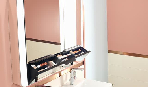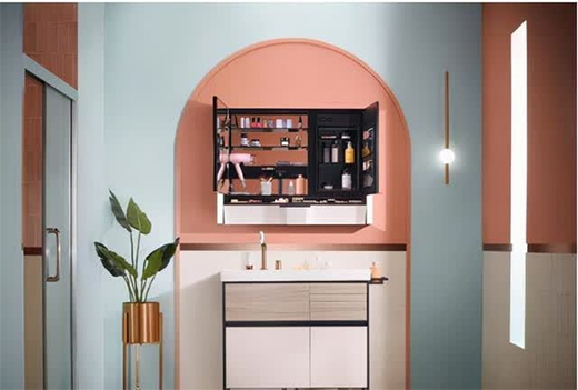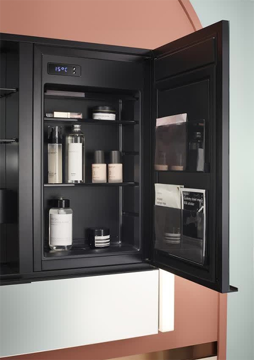 值得一提的是,鏡柜還有內(nèi)置“美妝冰箱”,不同季節(jié)可以按需調(diào)控溫度,這個設計可以說是很人性化了。此外,鏡柜下方的便捷式翻抽空間以透明隔層合理分隔成若干個分區(qū),大小形狀不一的彩妝用品均可整齊排列,可作為“口紅吧”收納約100支口紅。