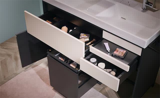 科勒新推的組合浴室柜,充分利用內(nèi)部空間,設計了面膜支架,收納眼鏡、吹風機、卷發(fā)棒、插電式美容儀等用品的儲物架以及插座,可吸附指甲鉗、修眉刀等金屬小件的磁力圈。