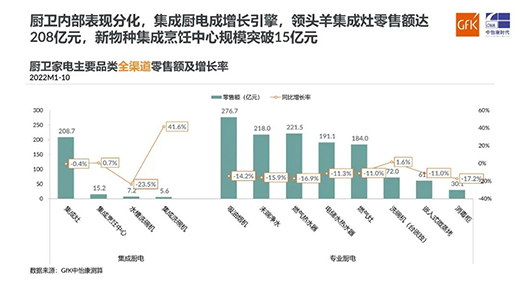 廚衛(wèi)電器遭遇挑戰(zhàn),內(nèi)部品類分化明顯。發(fā)展時間較長、較為成熟的油煙機(jī)、燃?xì)庠睢崴鞯葘I(yè)廚電產(chǎn)品出現(xiàn)了零售額大幅同比下滑。2022年1~10月,油煙機(jī)零售額同比下滑14.2%,燃?xì)庠钕禄?1.0%,燃?xì)鉄崴飨禄?6.9%,降幅基本都大于行業(yè)平均水平。作為行業(yè)發(fā)展新引擎的集成廚電則在不斷發(fā)展壯大,從目前數(shù)據(jù)看,包括集成灶、集成烹飪中心、水槽洗碗機(jī)、集成洗碗機(jī)等品類在內(nèi),集成廚電規(guī)模已經(jīng)達(dá)到237億元,在廚衛(wèi)電器內(nèi)部占比達(dá)到了15%。其中,集成洗碗機(jī)零售額同比漲幅達(dá)到41.6%,表現(xiàn)優(yōu)異;集成灶零售額保持穩(wěn)定,規(guī)模達(dá)209億元,位列廚衛(wèi)電器行業(yè)第四位,相信隨著后期疫情的解封和管控政策變化,壓抑的需求會再次釋放,品類將迎來利好。