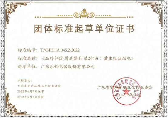 2023年,樂鈴憑借著在廚房電器領(lǐng)域內(nèi)吸油煙機(jī)和集成灶對廚房油煙難關(guān)的攻克,參與《健康吸油煙機(jī)》、《健康集成灶》等團(tuán)體標(biāo)準(zhǔn)的制定,推動(dòng)行業(yè)的健康升級,守護(hù)億萬家庭的呼吸健康。