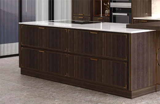 在轉(zhuǎn)角臺的設(shè)計中,經(jīng)典中式門型設(shè)計加上金色拉手和角花,濃郁的中式元素將中式風格的底蘊發(fā)揮得淋漓盡致。白色的巖板和臺面搭配別具韻味的多種中式元素,絲毫不會讓人覺得怪異,只會覺得設(shè)計得恰到好處!