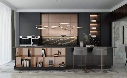 多功能島臺中島臺是開放式廚房的核心,它可作為餐桌、吧臺、操作臺使用,同時還具有收納能力,開放式廚房的中島臺能劃分客廳和廚房。達到隔而不斷的效果,能夠增強家人之間的互動性。