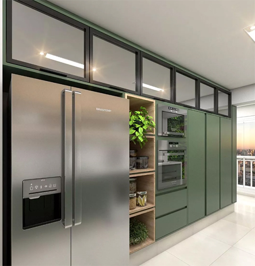 此套是“柏林赫塔”的用戶家裝,櫥柜整體采用綿綿綠的顏色,讓整體濃郁的色彩呼之欲出。廚房造型為雙一字型,一面為操作臺,一面為強大的收納柜,也是很實用的。