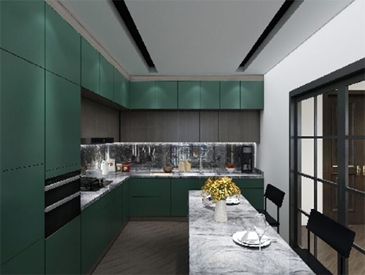 松波綠柜體搭配水墨紋元素,讓廚房既有時(shí)尚創(chuàng)意感,又不乏高級(jí)之美。在極簡(jiǎn)設(shè)計(jì)下囊括超強(qiáng)功能體驗(yàn),搭配中央島臺(tái),讓廚房井井有條。