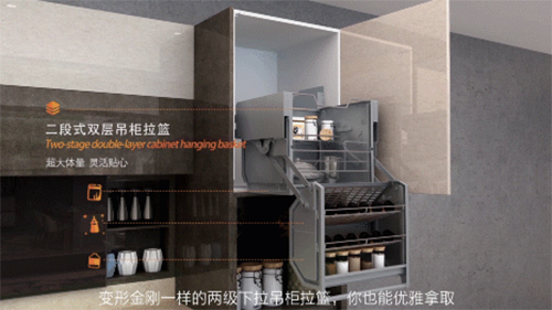 歐派櫥柜二段式雙層吊柜拉籃用于收納更多烹飪材料,分段式設(shè)計(jì)不僅裝得更多,空間利用率也更高,尤其方便老人拿放在高柜上的東西。