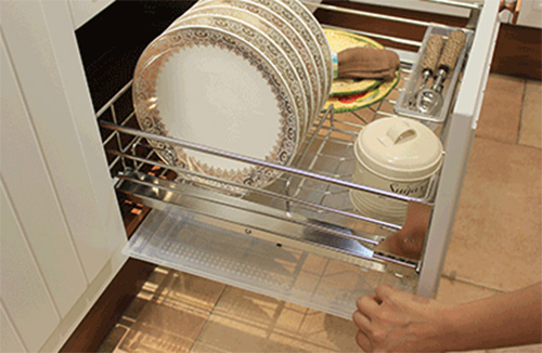 不銹鋼金屬軟管再配上底部的擋水板,既可以方便地存放碗碟,又可以防止有水滴到櫥柜上,便于老人家清理碗柜。