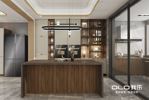 我樂整體櫥柜的“容悅”系列,也同樣能讓廚房溫暖加倍。該系列由鳶尾雅灰與黛木棕兩款花色組成,描金線條的加入提亮了空間。而在搭配中,我樂的設(shè)計(jì)師們常常加入茶色玻璃元素,這不僅能讓精致的餐盤器具成為廚房空間展陳的一部分,也讓廚房空間更有人情味和煙火氣,暖意濃濃。