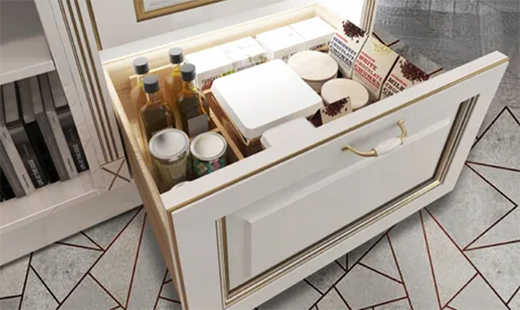 金色金屬的點(diǎn)綴表現(xiàn)出獨(dú)特的藝術(shù)骨感,不用太多的裝飾,就能彰顯高品質(zhì)浪漫。金屬拉手還能凸顯廚房的輕奢氣息,讓整個(gè)櫥柜顯得卓爾不凡。