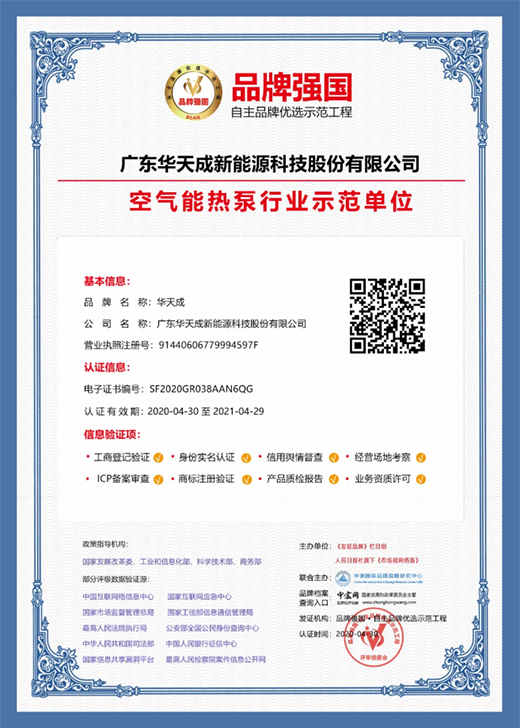 近日,經過品牌強國·自主品牌優(yōu)選示范工程辦公室審核、網絡輿情指標監(jiān)察、社會公示等入圍審查流程,廣東華天成新能源科技股份有限公司成功入選品牌強國?自主品牌優(yōu)選示范工程空氣能熱泵行業(yè)示范單位。作為空氣能行業(yè)專業(yè)領軍品牌,華天成此次入選“品牌強國工程”,展現了其在科技創(chuàng)新和品牌實力等方面的引領作用獲得國家級媒體平臺的認可。
