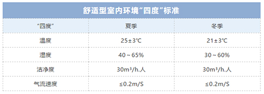 歐思丹認(rèn)為,室內(nèi)空氣環(huán)境中,影響舒適度的有“四度”:空氣的溫度、濕度、潔凈度、氣流速度。這“四度”是人最容易感知的,它們能夠直接影響到人們的舒適程度。舒適型室內(nèi)環(huán)境的“四度”標(biāo)準(zhǔn)是什么?一個(gè)表格讓您一目了然!