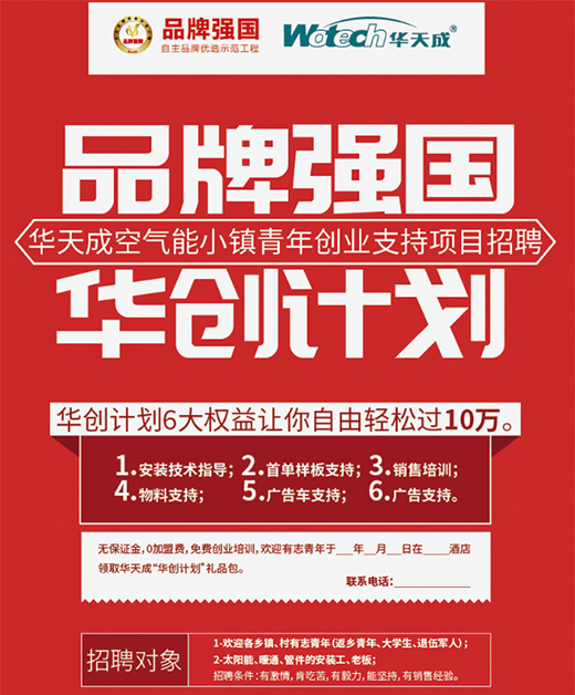 七月,華天成還啟動(dòng)了青年創(chuàng)業(yè)扶持計(jì)劃啟動(dòng),針對(duì)河北區(qū)域的有志青年推出品牌強(qiáng)國(guó)華創(chuàng)計(jì)劃。華天成免費(fèi)進(jìn)行創(chuàng)業(yè)培訓(xùn),安裝技術(shù)指導(dǎo),首單樣板支持,銷售培訓(xùn),物料支持,廣告車支持,為大家掃平創(chuàng)業(yè)路上的障礙。