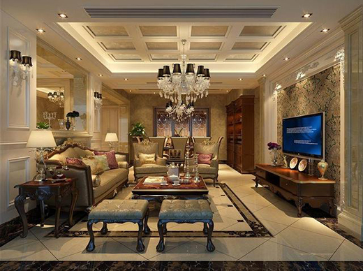 客廳華麗的燈飾吊頂和精致的花紋雕飾,兩者共同構(gòu)成了歐式風(fēng)格的基本裝飾要素。