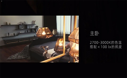 剛才講解的主燈的照明方式采用的是直接光照明,直接照明最大的好處是,光可以被最大限度的利用,但是最大問題就是眩光問題,臥室空間比任何一個空間對防眩要求都要高。