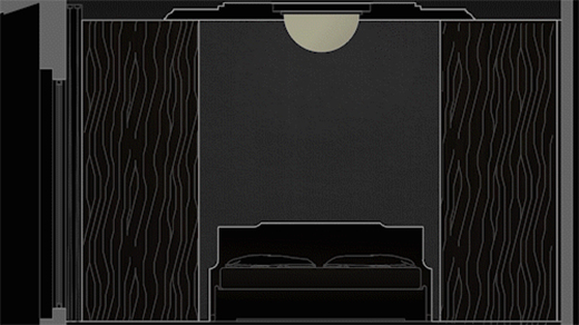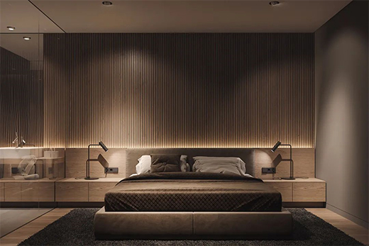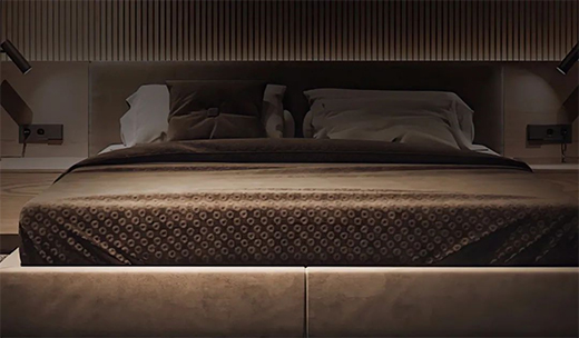 首先我們來看下床頭部分的照明設(shè)計,床頭部分的照明分為兩個區(qū)域,一個是墻面床頭照明,另一個是床頭柜的照明,私宅空間中,枕頭部分需要光,但是不需要使用直接光進(jìn)行照明,如果有直接照明的射燈,很容易給人一種壓迫感,所以我們可以在床頭天花上方安裝洗墻燈帶。