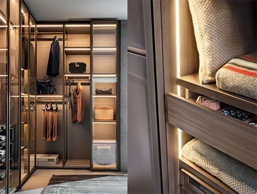 2)衣柜內(nèi)部安裝照明的燈具采用這種照明方式要注意選擇發(fā)熱量較少的燈具LED燈具,以免燈具長時間使用后產(chǎn)生的熱量造成危害,在安裝位置上,要靠外側(cè)安裝,這樣才能保證我們可以清晰的選擇衣物,尤其要注意的是在采用內(nèi)部燈具時,最好使用感應(yīng)式的燈具,可以使用手掃式的感應(yīng)燈,也可以是柜門開關(guān)的感應(yīng)方式,柜門打開燈亮起,柜門關(guān)閉燈也關(guān)閉,這樣在選擇和整理衣物的時候更加方便。