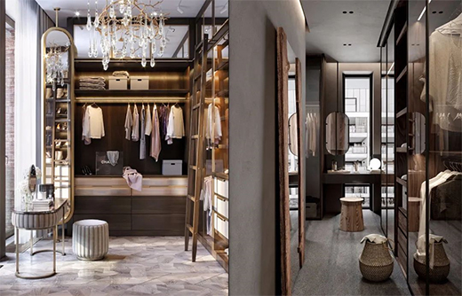 在一些大平層或別墅空間中,會有獨(dú)立的衣帽間設(shè)置,這種衣帽間的衣柜大部分是敞開式的,沒有柜門,在設(shè)計這種衣柜照明的時候,就不建議采用感應(yīng)式的燈具了,而是采用正常的天花燈具來提供照明。