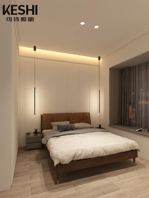 稍顯無(wú)趣的床頭板,安裝上明裝線性燈,光線柔和,突顯紋理,床頭板一瞬間便變得靈動(dòng)有趣起來(lái),這也許便是燈光設(shè)計(jì)的魅力吧!