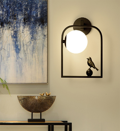 壁燈采用簡(jiǎn)約的幾何造型設(shè)計(jì),方圓結(jié)合,剛?cè)嵯酀?jì),鳥(niǎo)兒置于深色鐵藝燈架之中,打破其既定格局,望向一輪懸在高空的圓滿明月,寓意美好團(tuán)圓。