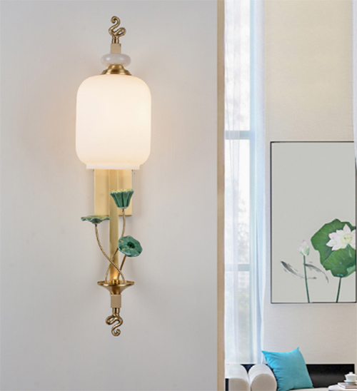 精巧的陶瓷荷葉裝飾,造型生動(dòng)有趣,蓮花高潔,亭亭凈植,為空間注入文人墨客的儒雅之氣。陶瓷燒制喚醒東方歷史文化底蘊(yùn),不僅極易清潔,更能使壁燈展現(xiàn)風(fēng)雅之姿。