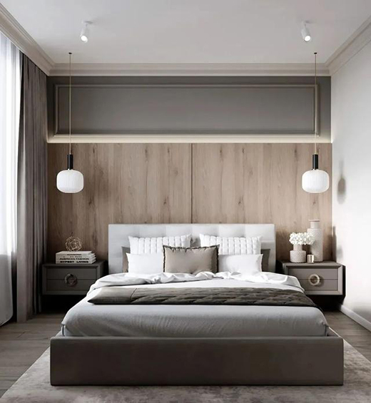 ▼ 臥室同樣無主燈設(shè)計(jì),四角明裝筒燈以及吊線燈輔助照明,增加空間層次,同時(shí)更時(shí)尚。