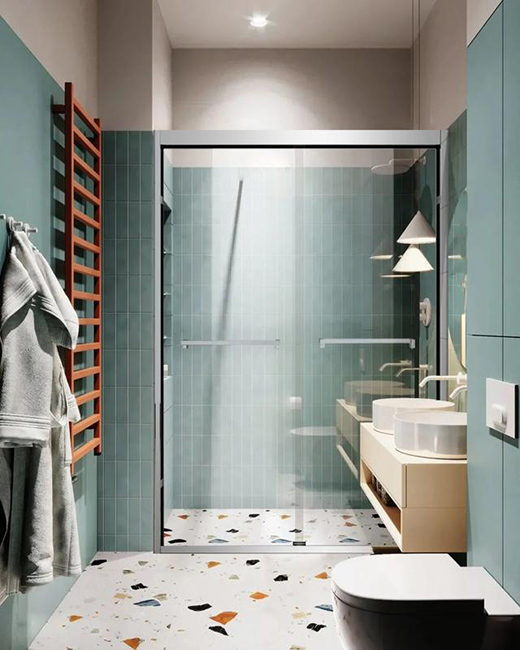 設(shè)計(jì)師選擇了登宇鏡光色淋浴房,搭配淡綠色空間,看起來時尚小清新。同時登宇淋浴房移門設(shè)計(jì),不占用空間的同時,有效改善浴室潮濕問題,阻隔沐浴時水花打濕干區(qū)。
