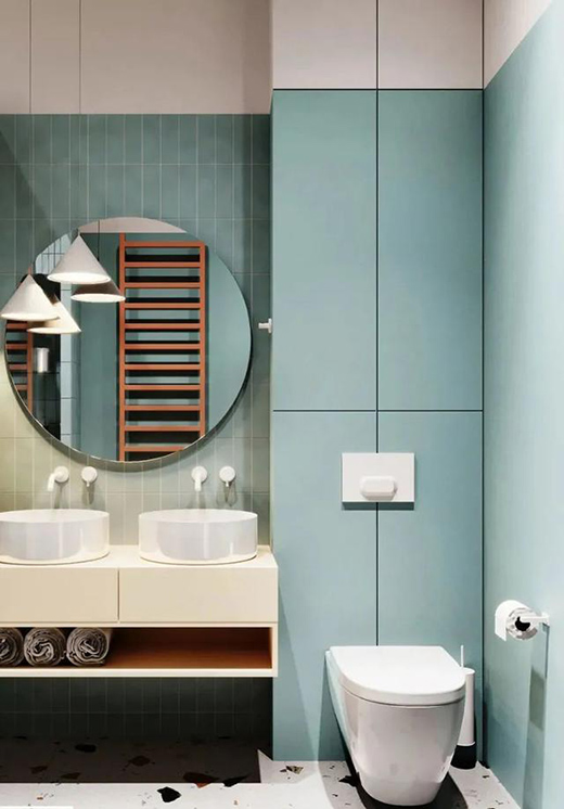 設(shè)計(jì)師選用雙臺洗漱柜,搭配時尚圓形鏡子,精致調(diào)皮,不僅可以滿足家人的洗漱而且充分利用墻面,壁龕置物格設(shè)計(jì),收納空間也是棒棒噠。