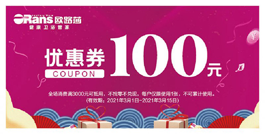 溫馨提示:3月5日-3月15日憑朋友圈轉(zhuǎn)發(fā)頁面領(lǐng)取,截圖無效,100元優(yōu)惠券全場消費滿3000元可以抵用,不找零不兌現(xiàn),每戶僅限使用一張,不可累計使用。(本活動最終解釋權(quán)歸歐路莎全國專賣店所有)