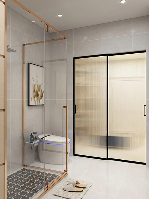 ▲入門選擇了極窄雅黑邊框+超白長虹玻璃的M1A全景門,朦朧感的玻璃既保護了隱私,又增加了空間的美感,讓浴室生活變得趣味十足。