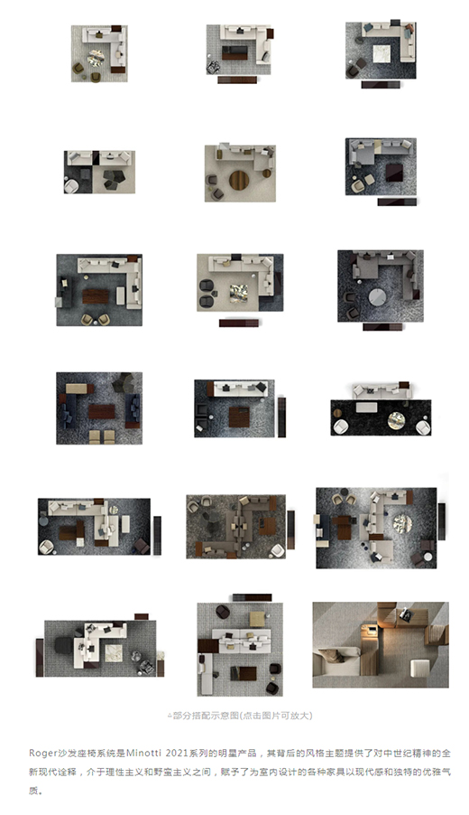 Roger沙發(fā)座椅系統(tǒng)是Minotti 2021系列的明星產(chǎn)品,其背后的風(fēng)格主題提供了對(duì)中世紀(jì)精神的全新現(xiàn)代詮釋,介于理性主義和野蠻主義之間,賦予了為室內(nèi)設(shè)計(jì)的各種家具以現(xiàn)代感和獨(dú)特的優(yōu)雅氣質(zhì)。