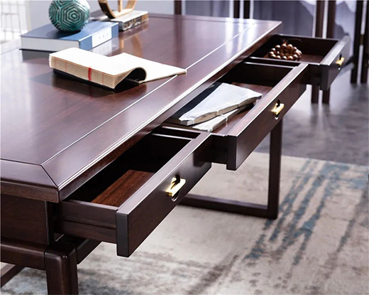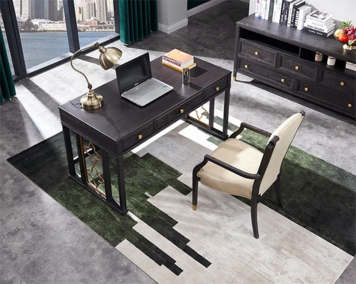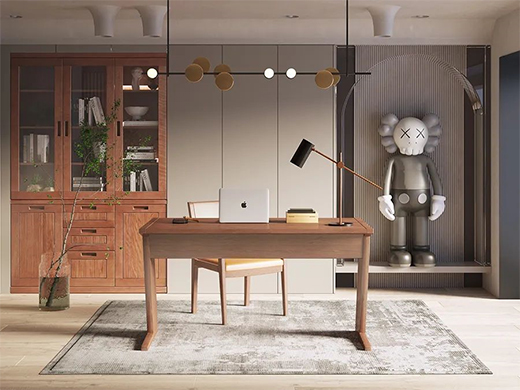 同時(shí)書桌的顏色深淺要注意,可參考書房的硬裝顏色來搭配。若硬裝是淺色系,那么書桌可選擇深色,以加強(qiáng)空間里的層次美感。