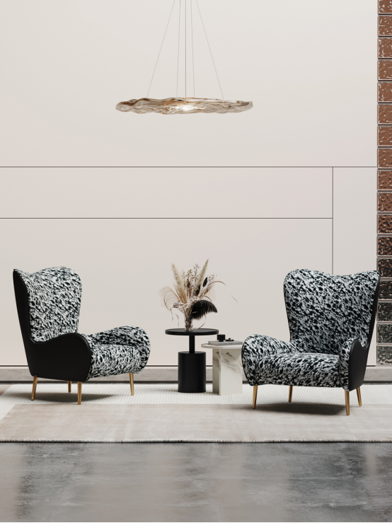 洛品有家參考安妮女王時期最具有代表性的安樂椅,并在此基礎(chǔ)上作出創(chuàng)新。這款休閑椅靠背與扶手相連,采用極繁主義的黑白印花,體現(xiàn)出洛品有家品牌深處的“輕柔嫵媚”。輕巧的腿,高高的靠背,兩側(cè)填翼并向前略略延伸,如女性的劉海和發(fā)冠,整體流暢舒適優(yōu)雅。