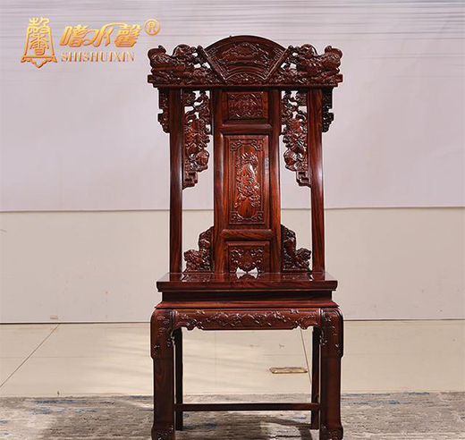 座椅靠背中間雕刻一只雄獅腳踏祥云目光如炬,直視前方,寓意為權(quán)勢、高貴、尊榮的象征,又是幸運與成功的標志。"祥云"則寓意著吉祥如意,順心如意。合在一起則為升官發(fā)財,吉祥如意。