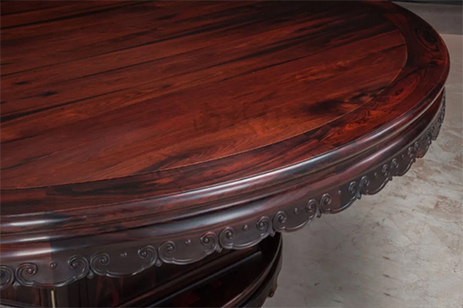 南枝紅為客戶定制圓餐桌不在少數(shù),今天為大家分享的一套客訂頗為恢弘大勢,直徑達(dá)2.38米的圓桌,配備了12件四出頭官帽椅,為符合現(xiàn)代餐桌多人進(jìn)食的需要,加配了轉(zhuǎn)盤。而讓人神往不已的,是全桌均使用了大紅酸枝(交趾黃檀)的芯材,細(xì)看其油性紋理,無不隱隱透著木材的在歷經(jīng)了歲月洗禮下沉淀的穩(wěn)固氣息。