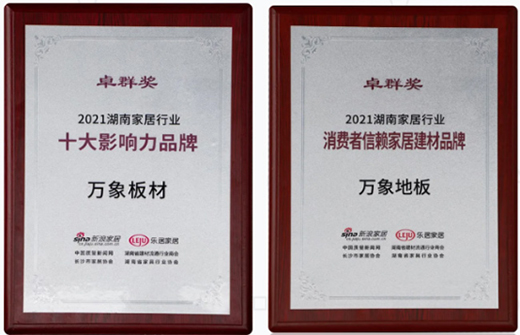 1月9日,以“以匠心 致美好”為主題的2021第五屆湖南家居產(chǎn)業(yè)發(fā)展峰會(huì)暨“卓群獎(jiǎng)”頒獎(jiǎng)盛典在長(zhǎng)沙君悅酒店舉行,這是一場(chǎng)立足當(dāng)下,放眼未來(lái),為2022年家居行業(yè)全域賦能的盛宴。萬(wàn)象品牌產(chǎn)品萬(wàn)象板材、萬(wàn)象地板分別獲得2021湖南家居行業(yè)十大影響力品牌獎(jiǎng)項(xiàng)、2021湖南家居行業(yè)消費(fèi)者信賴家居建材品牌獎(jiǎng)項(xiàng)。
