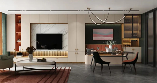 家居色彩可為浪漫點(diǎn)綴。北美深胡桃與菱形象灰皮紋搭配,自然柔和。細(xì)雨橘橙的活力,打破了空間的寧?kù)o,使空間洋溢著喜悅和活潑的氛圍,以明快的色彩點(diǎn)綴情侶幸福愉悅的時(shí)光。