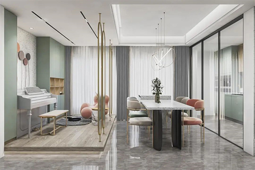 準(zhǔn)備一桌親手做的飯菜,彈一首動(dòng)人心弦的歌?!逗?jiǎn)居》的餐廳整體為一個(gè)多功能休閑區(qū),鋼琴區(qū)與餐廳互通。一邊是時(shí)光悠悠,你彈我唱,一邊是柴米油煙,細(xì)水長(zhǎng)流,詮釋了愛情最好的模樣。