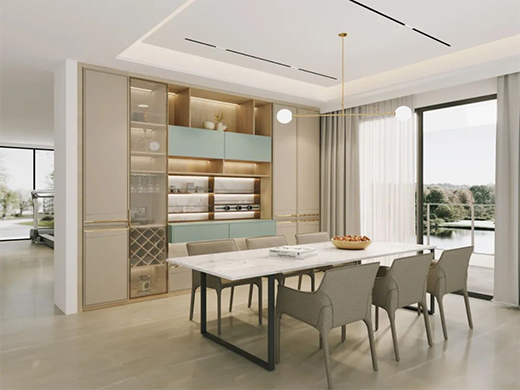 餐邊柜補(bǔ)充整體空間的儲(chǔ)物需求,解放桌面空間。除掩門收納外,餐邊柜開放式設(shè)計(jì)與玻璃掩門的組合,讓收納同時(shí)具備收藏展示功能。