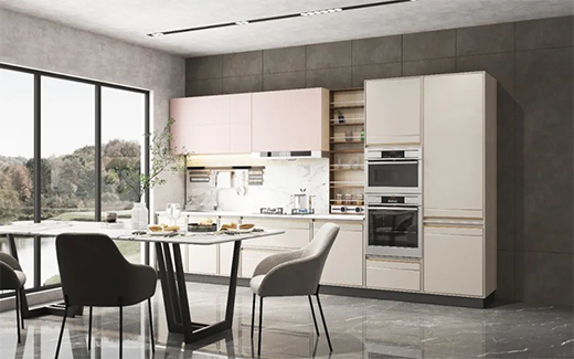 櫥柜更注重空間布局與使用功能的完美結(jié)合,電器選擇嵌入式的設(shè)計(jì),視覺更具統(tǒng)一性,整體感也更強(qiáng)。門板粉色系的加入,賦予空間靈動(dòng)活力,整體是不具沖突的美感,是沉穩(wěn)的高級感。