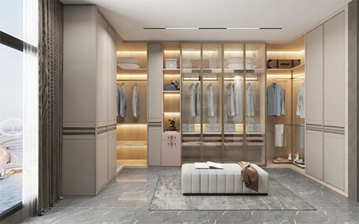 衣帽間整體以U字型設(shè)計(jì),木質(zhì)掩門、玻璃柜門、開放式收納在這個(gè)空間達(dá)到一種舒適的平衡,實(shí)用同時(shí)兼顧展示效果。