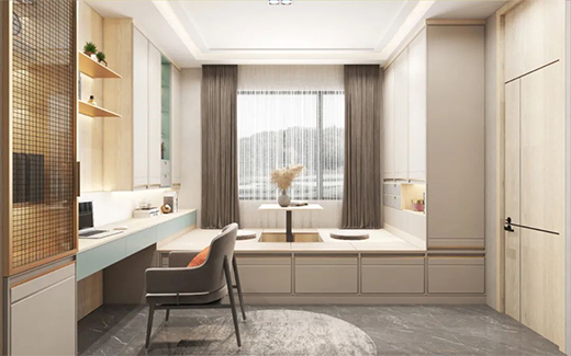 書房以溫和的木紋,恰到好處的莫蘭迪灰粉,再搭配精簡的爵士白,簡致而不失溫情。右側(cè)的玻璃高柜,提高空間整體高級感,打造適合辦公思考的環(huán)境,營造極佳的閱讀、辦公、學(xué)習(xí)氛圍。