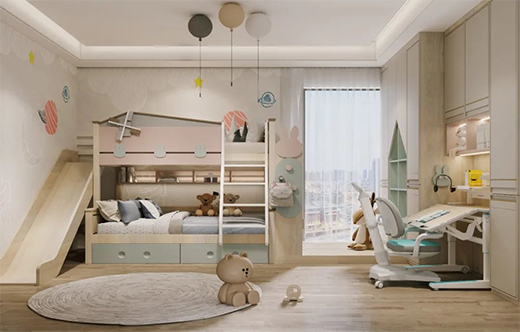 在滿足收納與睡眠功能同時(shí),加入小滑梯及卡通元素,充分釋放兒童好動(dòng)的天性。
