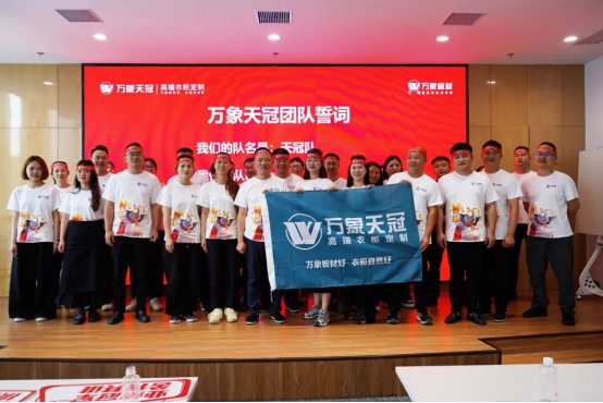 旺德府木業(yè)公司總經(jīng)理唐勇先生帶領(lǐng)萬象天冠品牌戰(zhàn)隊(duì)進(jìn)行宣誓,旺德府家居產(chǎn)業(yè)集團(tuán)總裁王仲豐先生授予象征團(tuán)隊(duì)榮譽(yù)的沖刺戰(zhàn)旗。