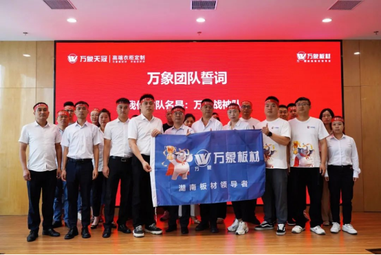 萬象建材公司總經(jīng)理湯科先生帶領(lǐng)萬象板材品牌戰(zhàn)隊(duì)進(jìn)行宣誓,旺德府家居產(chǎn)業(yè)集團(tuán)輪值董事長(zhǎng)劉偉先生授予象征團(tuán)隊(duì)榮譽(yù)的沖刺戰(zhàn)旗。