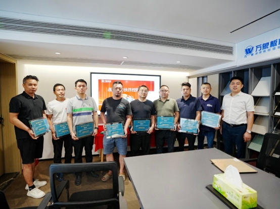 會(huì)議尾聲,旺德府家居集團(tuán)大客戶中心總經(jīng)理湯科先生為多家企業(yè)授予萬象板材 、萬象天冠品牌“戰(zhàn)略合作伙伴”證書并合影留念,這不僅是品牌價(jià)值的深度融合,更以可視化的儀式感傳遞出萬象品牌構(gòu)建行業(yè)生態(tài)共同體的戰(zhàn)略決心。
