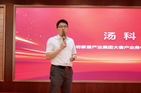 旺德府家居集團大客戶業(yè)務中心總經理湯科先生,圍繞政策與產品賦能體系進行詳細解讀。在闡述品牌及核心產品競爭優(yōu)勢的同時,重點強調板材+輔材的產品推廣布局,明確以此助力品牌與合作伙伴共同開拓高端家居市場。
